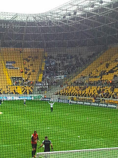Vor 22.000 Zuschauer, wovon 300 Gäste waren, hatte Dynamo die erste Halbzeit klar in Griff und hatte durch ein Pfostenschuss die beste Möglichkeit. Der Ball sprang jedoch vom Pfosten zurück ins Feld. Auch sonst war das Spiel der Heimherren bis zum gegnerischen Strafraum gefällig, dort war jedoch meistens Schluss. Die Duisburger waren in der ersten Halbzeit hinten sehr konzentriert, aber nach vorne ging nicht wirklich viel. Noch weniger aber ging heute in der ersten Halbzeit auf den Rängen. Die Heimseite zog sein Programm durch, was jedoch maximal unterer Durchschnitt war, lediglich die Anti-Hansa-Rostock-Gesänge waren wirklich laut und mobilisierten den Heimmob zu Ausbrüchen nach weit oben. Noch schlimmer aber waren die Duisburger, wie man 5 Spieltage vor Schluss mitten im Aufstiegskampf nur mit 300 Fans zum Auswärtsspiel reist und dann da auch noch gesanglich nichts auf die Ketten geht, hat die zweite Liga verdient (denn dort warten mit Sandhausen, Heidenheim usw. ja noch weitere Stimmungsfriedhöfe). Dann lieber 100 Jahre 3.Liga mit Gegnern, wie Halle, Rostock, Cottbus, Münster und wer weiß wer da noch alles von unten (vielleicht Magdeburg, Zwickau, Offenbach, Saarbrücken) oder oben (vielleicht 1860, Aue, St.Pauli) kommt.